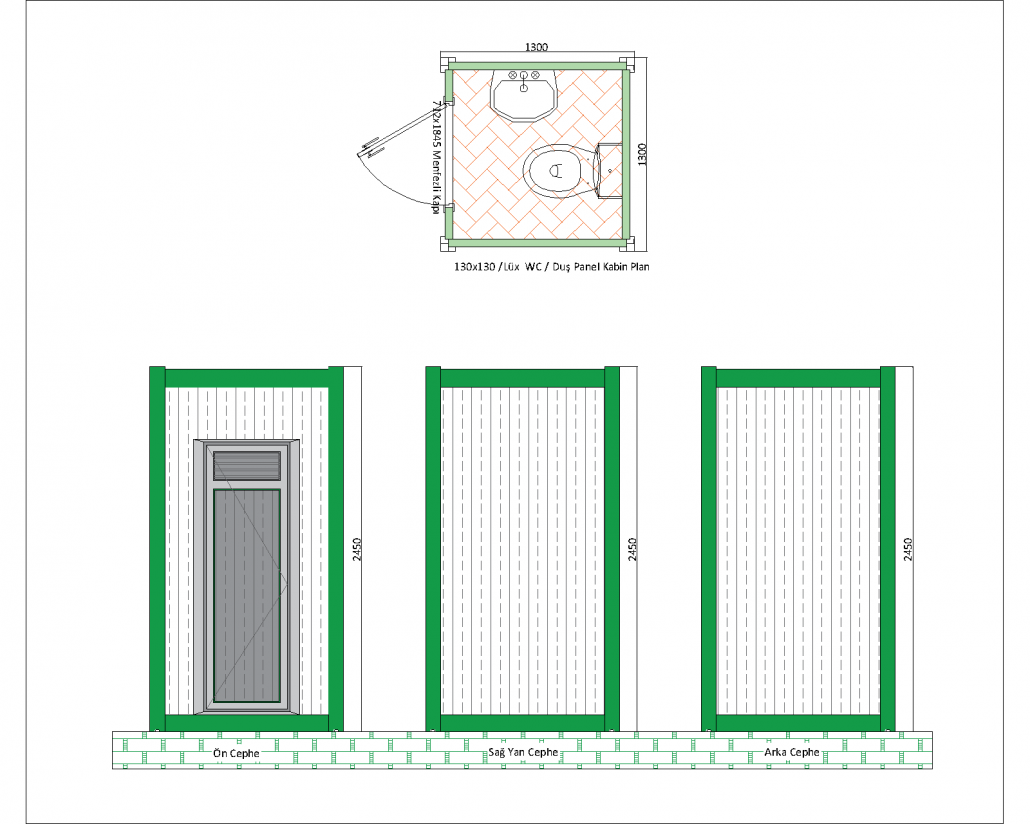 Bu panel kabin, WC ve duş alanını bir arada sunan kompakt bir çözüm olarak tasarlanmıştır. 1300 mm x 1300 mm ölçülerinde ve 2540 mm yüksekliğinde olan bu kabin, şantiyeler, açık hava etkinlikleri ve geçici tesisler için idealdir. İç düzenlemesinde lavabo, klozet ve duş alanı bulunmakta olup, kullanıcıların temel hijyen ihtiyaçlarını karşılayacak şekilde donatılmıştır.