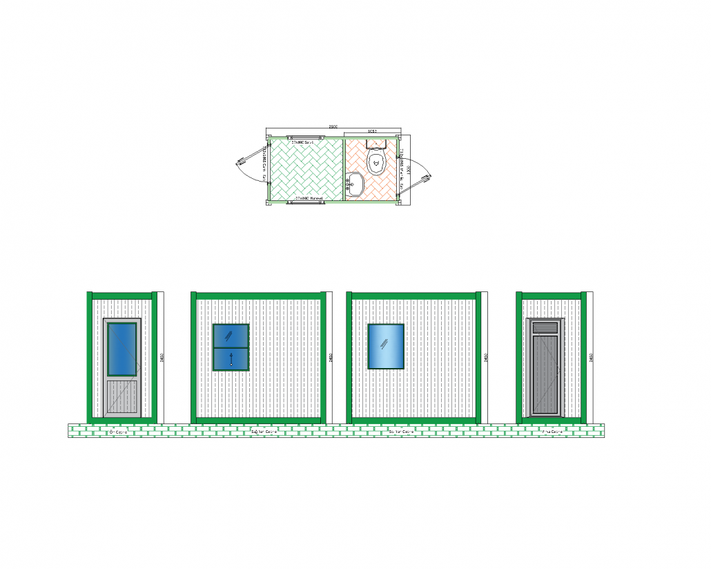 Ön cephede camlı bir kapı bulunurken, sağ yan cephede açılabilir bir pencere yer alır; bu özellikler iç mekanda doğal ışık ve havalandırma sağlar. Arka cephede ise ekstra ışık sağlayan sabit bir pencere bulunmaktadır. Sol yan cephede WC bölümü için ayrı bir kapı bulunmaktadır, bu da bağımsız giriş imkanı sunar.