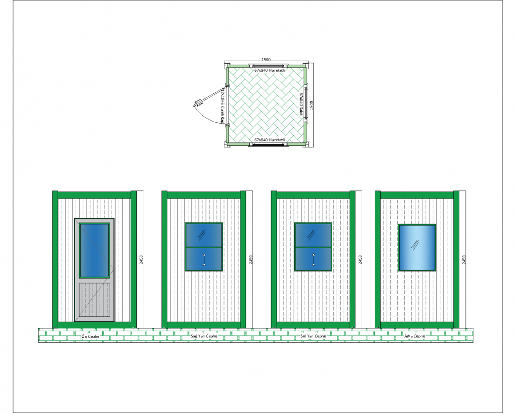 Ön cephede camlı bir kapı yer almakta olup, bu tasarım iç mekana doğal ışık girişini sağlar. Sağ yan cephede açılabilir bir pencere, sol yan cephede bir diğer açılabilir pencere ve arka cephede sabit bir pencere bulunmaktadır. Bu pencere yapısı, iç mekanın ferah ve aydınlık olmasını sağlarken aynı zamanda etkin bir havalandırma sunar.
