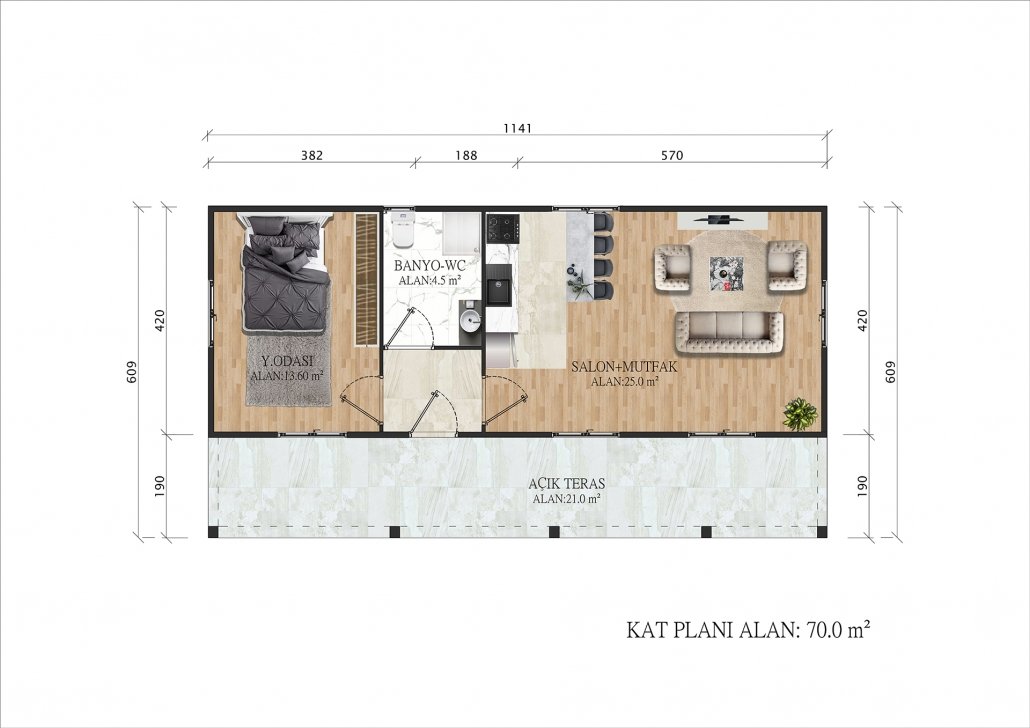 70 متر مربع من المساكن الجاهزة المكونة من طابق واحد